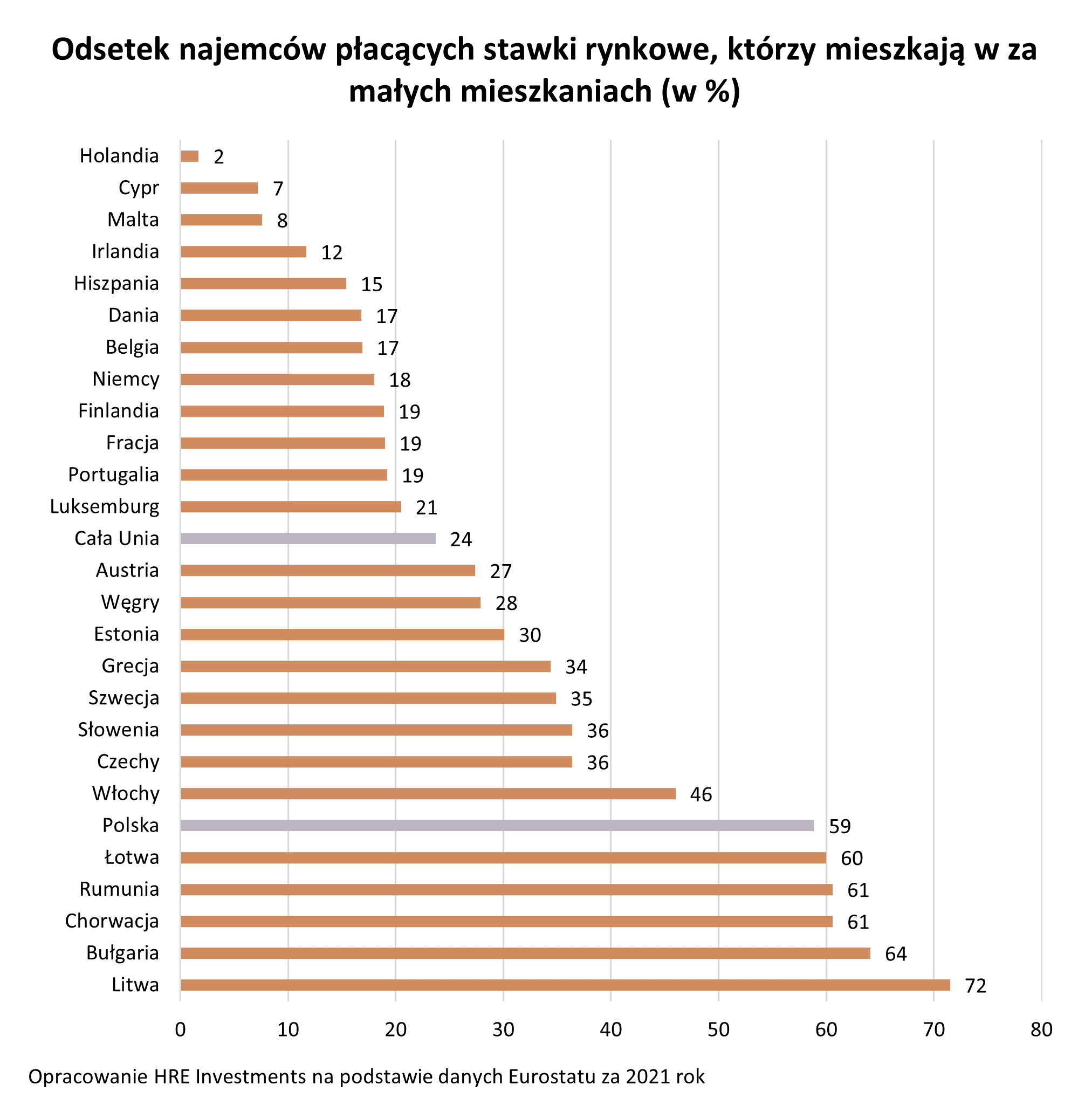 Niestety ma to negatywny wpływ na warunki mieszkaniowe najemców w Polsce. Rosnące stawki czynszów powodują bowiem, że część najemców zmuszona jest poszukiwać ofert o niższym standardzie. Dane Eurostatu już w 2021 roku świadczyły o tym, że sytuacja na rynku najmu w Polsce jest daleka od ideału. Zgodnie z danymi europejskiego urzędu aż 59% najemców płacących czynsz na zasadach rynkowych mieszkało w lokalach przeludnionych. To prawie 2,5 razy gorszy wynik niż unijna średnia.