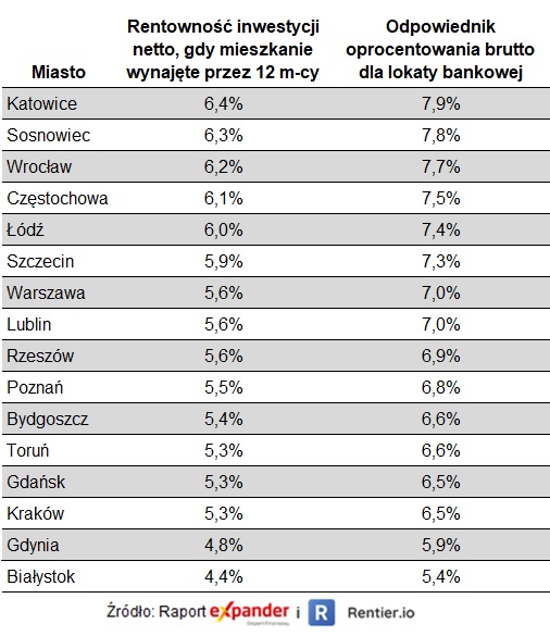 Relatywna opłacalność takiej inwestycji jednak spadła. W styczniu oprocentowanie lokat bankowych czy obligacji skarbowych wynosiło ok. 1%. Inwestycja w mieszkanie przynosiła więc wielokrotnie wyższe zyski niż ulokowanie pieniędzy w banku. Obecnie obligacje skarbowe mają oprocentowanie wynoszące w pierwszym roku 6,75% – 7,25%, a najlepsze lokaty nawet 10%. Dlatego pomimo poprawy rentowności nie ma zbyt wielu chętnych do inwestycji w mieszkania na wynajem. To się zmieni dopiero, gdy wyraźnie spadnie poziom stóp procentowych.
