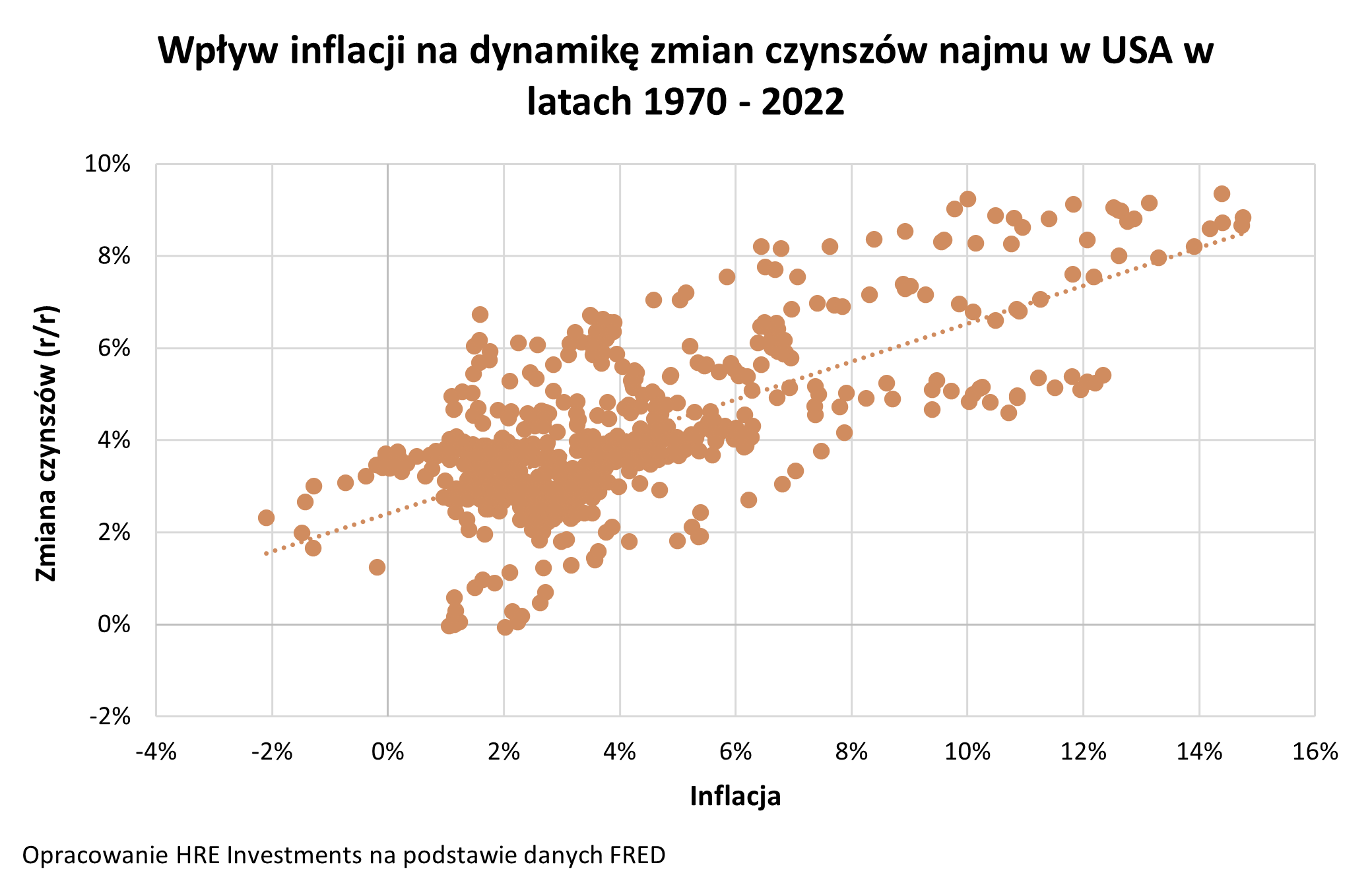 Ponadto jeśli spojrzelibyśmy na dane za dłuższy okres, a więc za lata 1970-2022, to okaże się, że istnieje dość silna korelacja pomiędzy poziomem inflacji i tym jak szybko rosły stawki czynszów najmu. To potwierdza, że otoczenie rosnących cen sprzyja podwyżkom ordynowanym najemcom przez właścicieli nieruchomości na wynajem. Co więcej, istnieje nawet mocniejsza korelacja pomiędzy poziomem stóp procentowych w USA i tym ile najemcy musieli płacić za zajmowane nieruchomości. To kolejne potwierdzenie na mechanizm, w którym rosnące koszty kredytu i trudniejszy dostęp do hipotek powodują, że więcej osób jest zmuszonych do najmu. Efektem są wyższe stawki czynszów. Jeśli więc jakiś najemca myśli, że nie dotyczą go wyższe stopy procentowe, to niestety dane historyczne sugerują, że jest w błędzie.