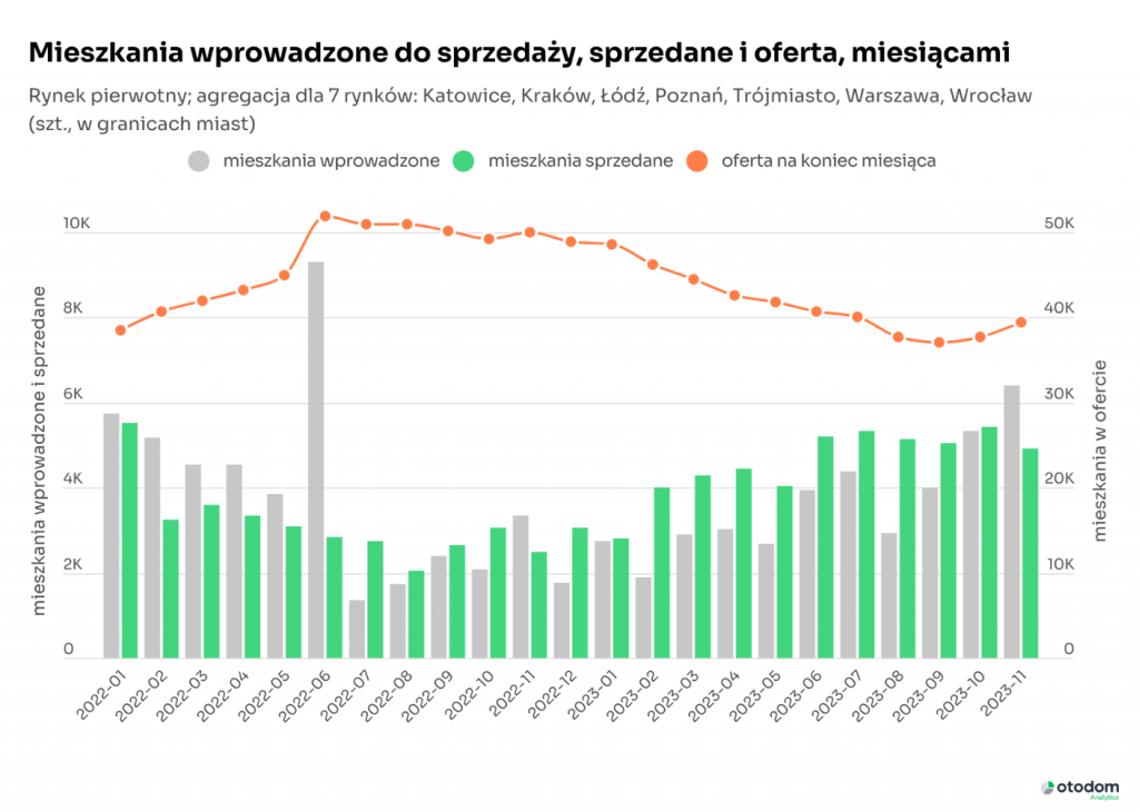 Bezpieczny Kredyt 2% był stymulantem rynku przez ostatnie miesiące i dzięki temu rynek mieszkaniowy wrócił do życia. Najpierw wiatru w żagle złapał popyt. W jego trwałość i długoterminowość deweloperzy nie do końca uwierzyli, więc wiele budów zostało wstrzymanych. Jak wskazują dane Otodom Analytics, już na początku roku na rynku pierwotnym w siedmiu najważniejszych miastach miesięcznie sprzedawało się ponad 4 tys. mieszkań. W każdym miesiącu w okresie czerwiec-październik sprzedaż przekracza 5 tys. lokali miesięcznie. W listopadzie poziom sprzedaży jest zbliżony, ale na rynek trafiło więcej nowych lokali (ponad 6 tys.), dzięki czemu dostępna oferta zaczęła rosnąć.