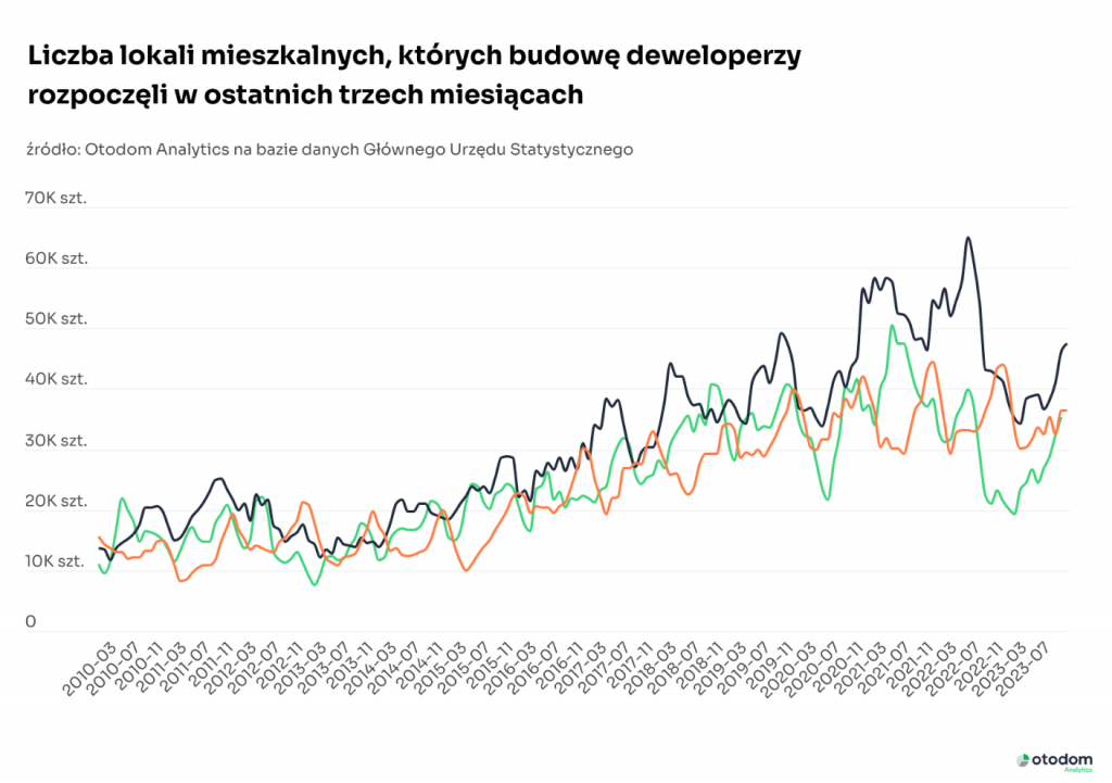 Dane GUS zagregowane w trzymiesięcznych okresach dają szerszy obraz rynku, gdyż miesięczne wartości bywają zaburzone przez pojawiające się duże projekty deweloperskie. Obecnie widać wyraźnie, że liczba pozwoleń na budowę i nowych budów dynamicznie rośnie, ale do rekordowych poziomów sporo brakuje.