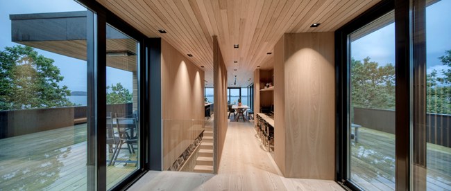 Te cele udało się harmonijnie osiągnąć, dzięki przemyślanej kombinacji drzwi podnoszono-przesuwnych serii Schüco ASS 70.HI z systemem fasadowym Schüco FWS 50.HI. Umieszczona na poziomie przyziemia, szeroka na sześć metrów i sięgająca od podłogi do sufitu fasada została ustawiona pod kątem do linii wybrzeża, dzięki czemu zapewnia panoramiczny widok z pomieszczeń na południowy-zachód. Z tej części można podziwiać relaksujące krajobrazy w chłodne, ciemne miesiące.
