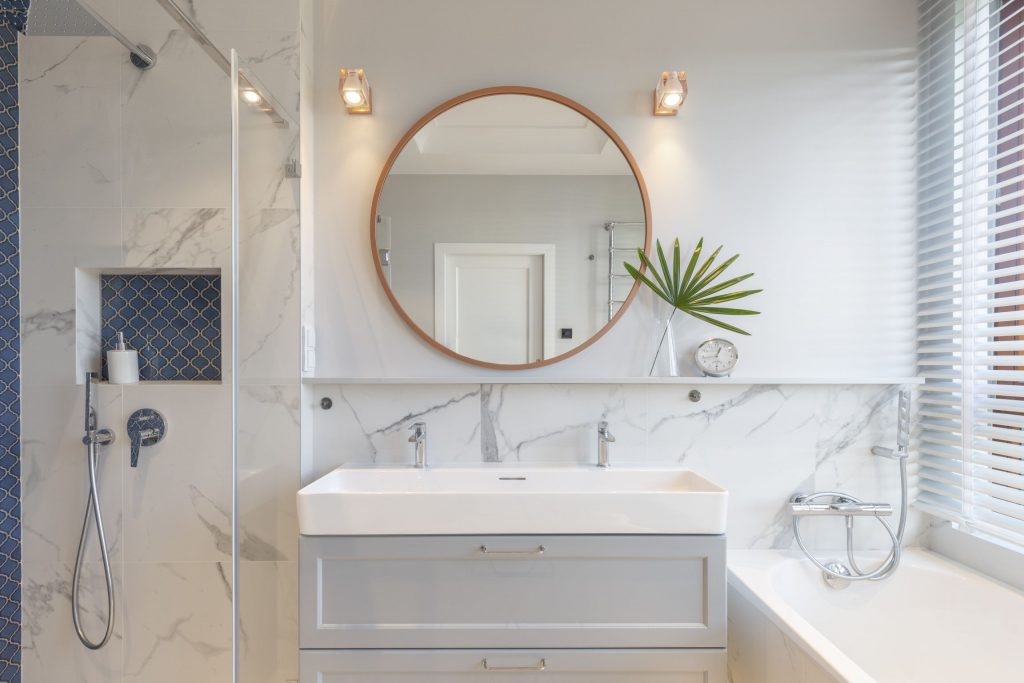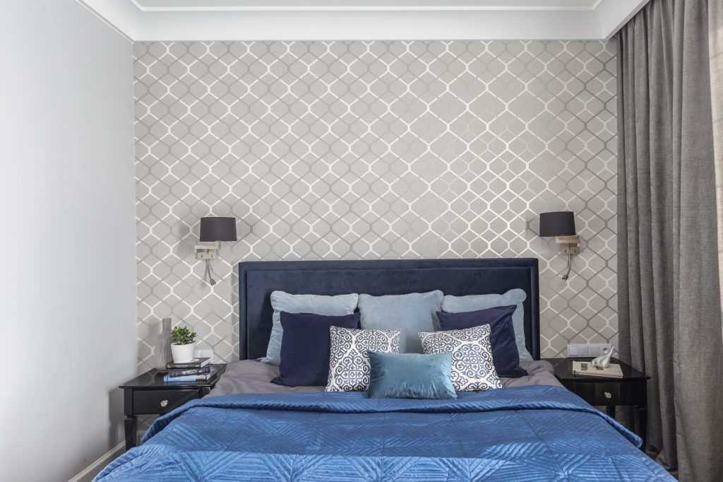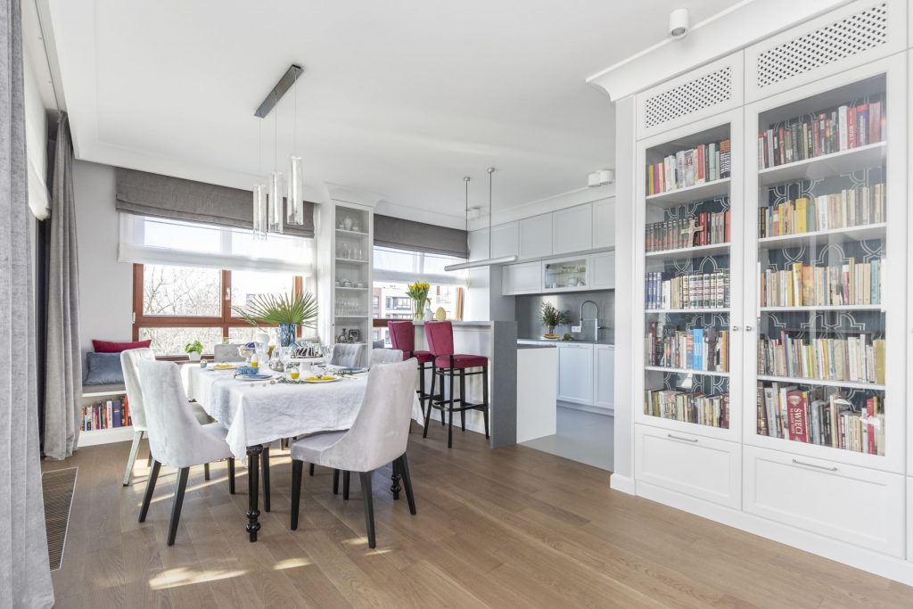 W warszawskim apartamencie próżno jednak szukać dosłownych odniesień marynistycznych. Inwestorzy i architekci wspólnie doszli do wniosku, że byłyby one nie na miejscu. Inspiracje stylem Hamptons odnajdziemy w konsekwentnie stosowanej, przytłumionej kolorystyce, bazującej na delikatnych szarościach, złamanej bieli i zgaszonych błękitach. Wzór tapety, która pojawia się w gabinecie, a także na drzwiach do gościnnej łazienki – doskonale wkomponowanych w zabudowę biblioteki – to z kolei wyraźne odwołanie do klasyki stylu nowojorskiego. Innym ciekawym elementem, który architekci Decoroom przenieśli zza oceanu do Warszawy są wygodne siedziska pod oknami w kuchni i jadalni. Przestrzeń pod nimi wykorzystano jako dodatkowe miejsce na książki.