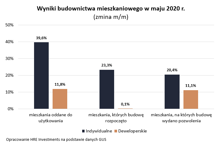 Jeszcze mocniejsze ożywienie widać w przypadku inwestorów indywidualnych, gdzie w każdym z badanych obszarów mamy do czynienia z ponad 20-proc. wzrostami, a liczba mieszkań (domów) oddanych do użytkowania przez osoby fizyczne była w maju o prawie 40% wyższa niż miesiąc wcześniej. Oczywiście należy opatrzeć ten fenomen komentarzem – kwiecień był bowiem miesiącem gwałtownego załamania aktywności inwestorów indywidualnych związanego z lockdownem. Z problemami lepiej radzili sobie deweloperzy, którzy pomimo ograniczeń starali się w miarę możliwości utrzymać produkcję mieszkań i procedowanie procesów administracyjnych. Stąd właśnie znacznie dynamiczniejsze majowe odmrażanie aktywności inwestorów indywidualnych niż deweloperów.