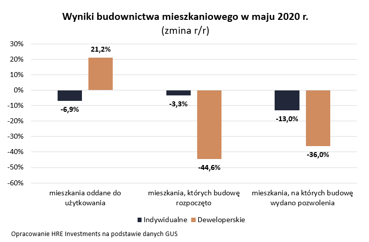 Znacznie gorzej wyglądają bowiem dane dotyczące liczby rozpoczynanych nowych inwestycji czy wydanych pozwoleń. Porównując maj 2020 r. do maja 2019 roku mamy do czynienia ze spadkami odpowiednio o prawie 45% i 36%. To sugeruje, że w otoczeniu niepewności deweloperzy zrezygnowali w maju z rozpoczynania sporej części nowych inwestycji.