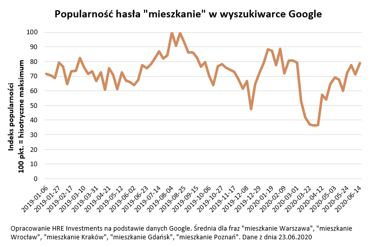 Doniesienia o poprawiających się wynikach sprzedaży sugerują, że już w czerwcu możemy mieć do czynienia z większą skłonnością do rozpoczynania nowych projektów. Odbudowanie popytu na mieszkania widać też w statystykach dotyczących ruchu w internecie. Ten dotyczący mieszkań w dużych miastach już od kilku tygodni jest na poziomie sprzed roku, pozostając tylko trochę poniżej tego, z którym mieliśmy do czynienia na początku br. Dla nowych decyzji inwestycyjnych firm deweloperskich ważne są jednak też prognozy gospodarcze czy skala rezygnacji dotychczasowych nabywców z podpisanych kontraktów. Niestety na dokładniejsze dane na ten temat musimy jeszcze trochę poczekać. I choć spodziewamy się lepszych danych GUS o budownictwie mieszkaniowym za czerwiec, to wciąż mamy za mało informacji, aby rzetelnie oszacować skalę ożywienia.