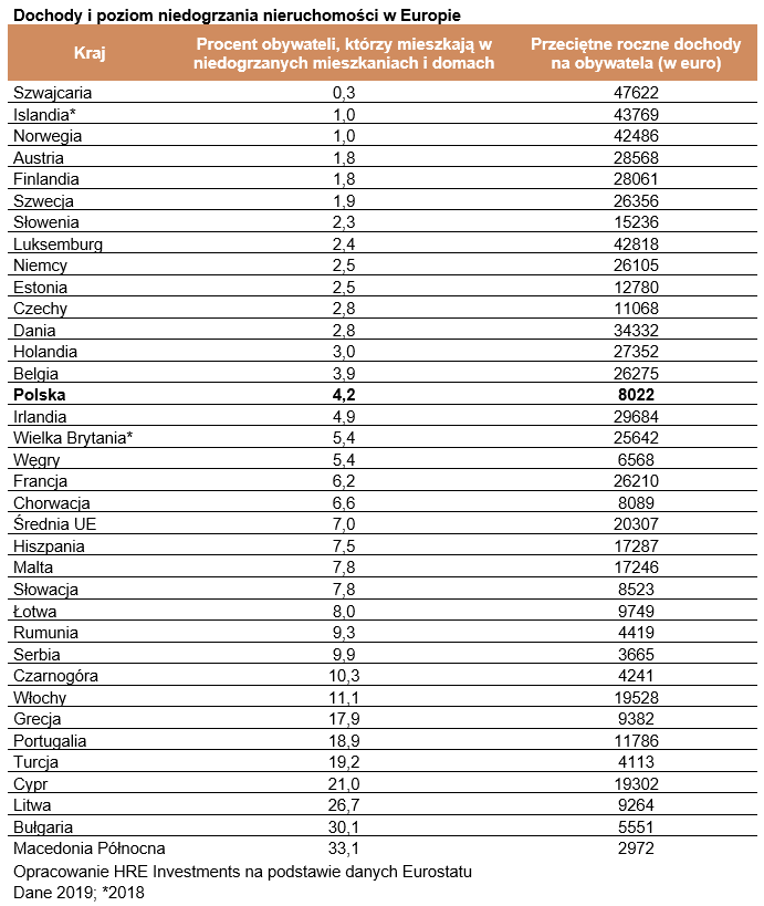 Na pierwszy rzut oka winne mogą być zarobki. Najpewniej właśnie dlatego na pierwszym miejscu najbardziej niedogrzanych krajów jest Macedonia Północna. Jest to też kraj o najniższym przeciętnym dochodzie (niecałe 3 tys. euro rocznie) z grona 35 państw, dla których Eurostat zbiera odpowiednie dane. Na kolejnych miejscach mamy też Bułgarię. Tam dochody ludności także są w europejskim ogonie (5,6 tys. euro rocznie). Pewnym zaskoczeniem może być jednak Litwa zajmująca trzecie miejsce w czołówce niedogrzanych krajów. Pomimo tego, że przeciętny Litwin dysponuje o 15% wyższym dochodem niż Polak, to i tak ponad ¼ Litwinów narzeka na niedogrzanie nieruchomości. Jest to wynik kilka razy gorszy niż nad Wisłą. Owszem – u naszych sąsiadów klimat jest odrobinę chłodniejszy, ale to ani nie zarobki, ani nie srogie zimy powodują, że aż tak wielu Litwinów narzeka na to, że w ich domach jest zimno.