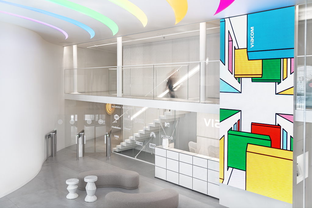 Nagrodzone biuro Viacom Polska to przykład przestrzeni zaprojektowanej specjalnie z myślą o młodym zespole pracowników. Liczący aż 4 500 m2 projekt powstawał etapami. Ostatni z nich zakończył się w czerwcu ubiegłego roku. Architektki Dorota Kuć & Karina Snuszka postawiły na otwarty plan przestrzeni, sprzyjający integracji. Powstały liczne sale konferencyjne oraz miejsca spotkań o mniej formalnym charakterze. Jedną z nich jest expercience room, w którym za pomocą najnowszej technologii „viar” można przeglądać pliki i dane „w powietrzu”. W części biurowej znajdziemy murale nawiązujące do komiksu i pop artu, dzieło artystów z Good Looking Studio. Na niecodzienną dekorację sufitu zdecydowano się w recepcji. Kształt oświetlenia i zmieniające się pastelowe barwy są bezpośrednim odwołaniem do znajdującej się jeszcze niedawno przy pobliskim Placu Zbawiciela instalacji „Tęcza”. Innym elementem witającym wchodzących jest videowall, na którym komunikowane są grafiki prezentujące marki z portfolio Viacom – kanały telewizyjne (m.in. MTV, Comedy Central) oraz aplikacje mobilne. A trochę futurystyczny klimat wprowadza robot recepcyjny. Po wpisaniu przez gościa odpowiednich danych, robot prowadzi do windy, a następnie wskazuje drogę do właściwej osoby.