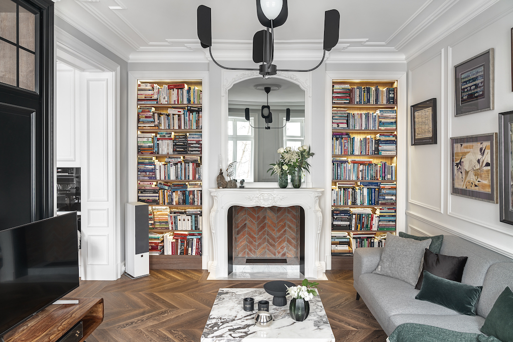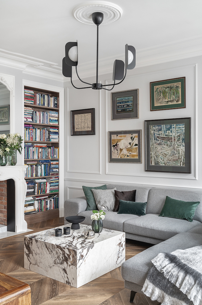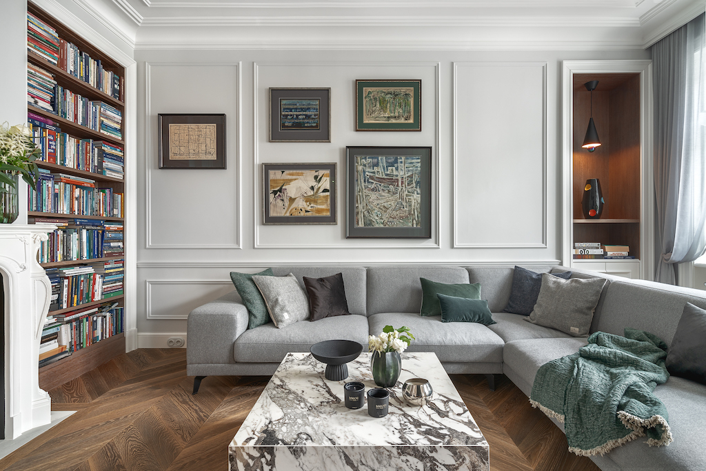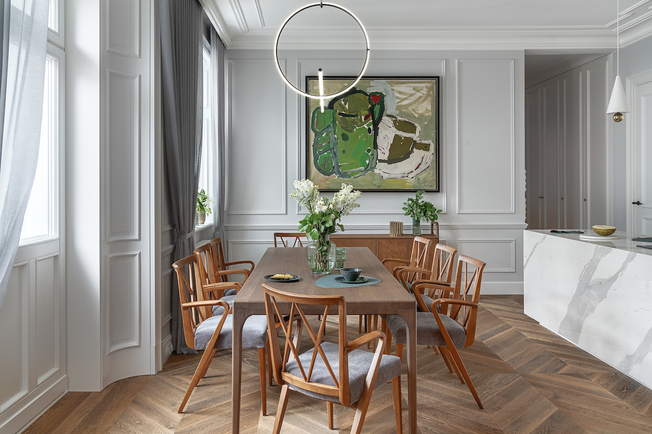 W oparciu o oryginały opracowano sztukaterie i profile całej domowej stolarki nawiązujące do historycznych wzorów. Kontrapunktem do ścian w chłodnych bielach i szarościach, jest drewniany parkiet ułożony, w przeżywający ostatnio prawdziwy renesans wzór chevron. Głęboki brąz francuskiej jodełki na podłodze to jedyny ciemny akcent kolorystyczny. Inne barwy, pojawiające się na tkaninach czy dodatkach, to delikatne, spłowiałe pastele. To celowy zabieg – zdecydowane kolory odciągałyby tylko uwagę od kolekcji współczesnego malarstwa zdobiącej ściany.