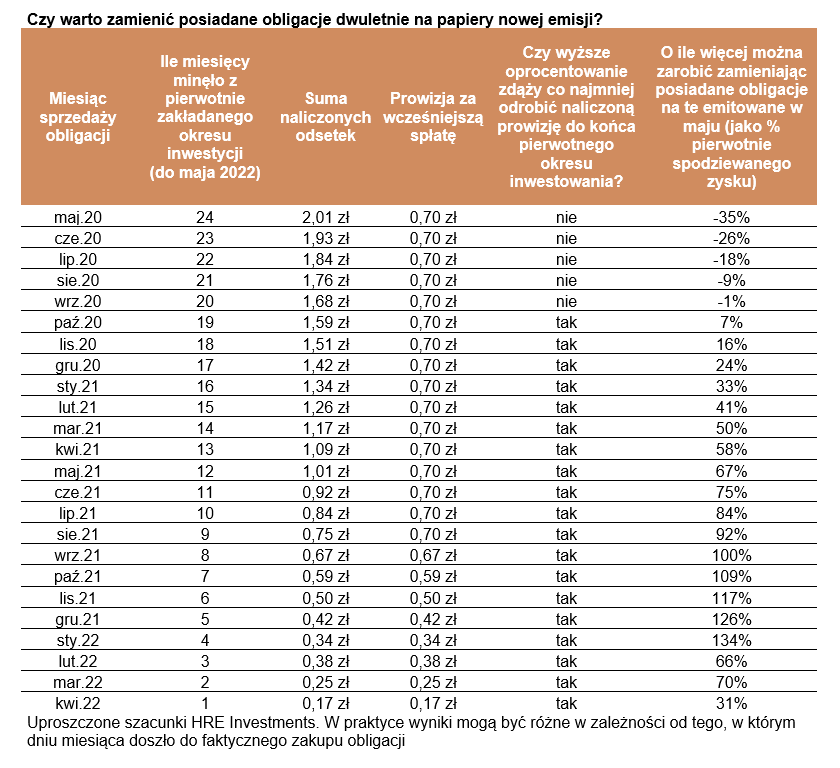 Taki ruch powinni rozważyć nie tylko Ci, którzy obligacje dwuletnie kupowali w 2022 roku, ale też Ci, którzy nabyli je w roku 2021, a nawet pod koniec 2020 roku. Dlaczego? Przez długi czas papiery dwuletnie były sprzedawane z oprocentowaniem na poziomie 1% w skali roku. Od maja 2022 roku takie obligacje będą sprzedawane z 3-proc. rentownością. To znaczy, że pomimo konieczności poniesienia opłaty za przedterminowy wykup papierów (zakończenie inwestycji przed czasem) szybko wyższe oprocentowanie pozwoli nam odrobić naliczoną opłatę i to nierzadko ze sporą nawiązką.