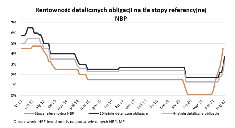 Co jednak warto podkreślić – dotychczas regułą było to, że oprocentowanie cztero- i dziesięcioletnich papierów w pierwszym roku inwestowania było wyższe niż to ile wynosiła stopa referencyjna NBP. Nawet po majowych zmianach ta sytuacja nie zostanie przywrócona. Przecież w maju RPP najpewniej znowu podniesie stopy procentowe. Ta najważniejsza (referencyjna) wynosić będzie około 5,0% – 5,5%, a więc znacznie więcej niż to na ile w pierwszym roku będą oprocentowane detaliczne obligacje skarbowe. Mało tego, rynek spodziewa się, że stopy procentowe mogą jeszcze dalej rosnąć. Wraz z kolejnymi takimi decyzjami poprawiane powinny też być warunki emisji detalicznych obligacji skarbowych.