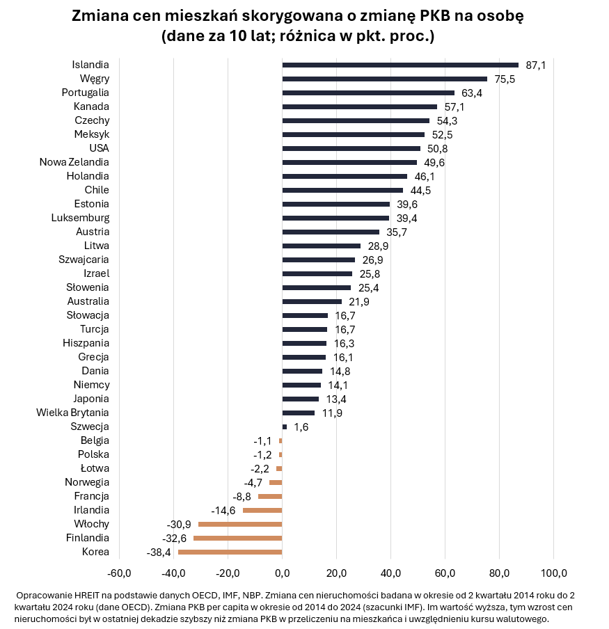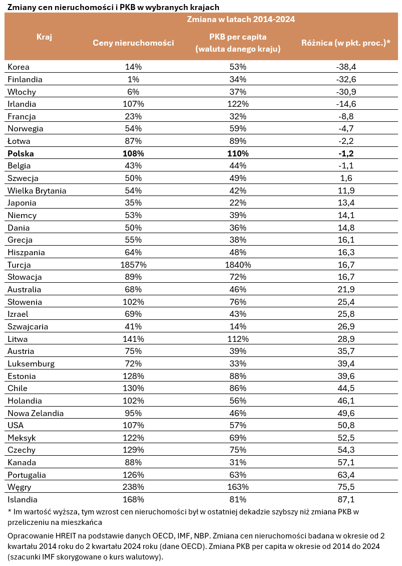Zebrane przez HREIT dane pokazują ponadto, że we wszystkich 36 przebadanych krajach ceny nieruchomości wzrosły w ciągu dekady średnio o ponad 22 pkt. proc. mocniej niż PKB w przeliczeniu na mieszkańca. U szczytu zestawienia znajdziemy Islandię, Węgry i Portugalię. Tam w ciągu dekady wzrost cen mieszkań wyprzedził wzrost PKB na osobę o od 63 do 87 pkt. proc. Warto też przytoczyć przykłady Szwajcarii i Kanady. Tam w ciągu ostatniej dekady dynamika wzrostu cen nieruchomości niemal trzykrotnie przekroczyła wzrost PKB na mieszkańca.