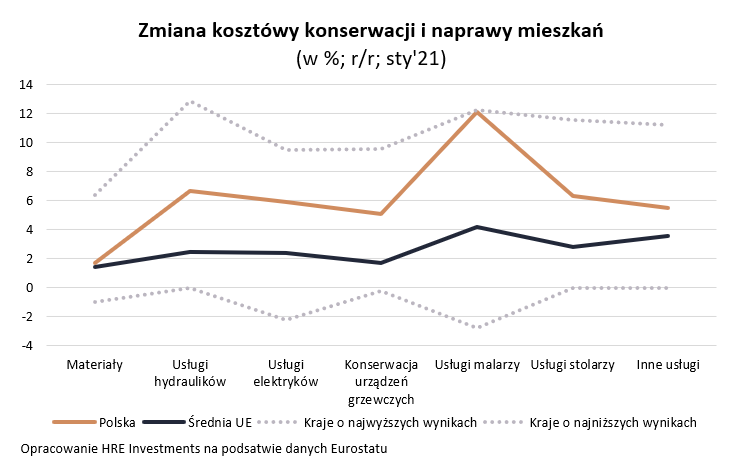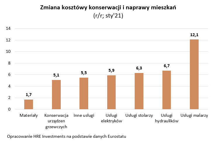 Wynika z nich, że najmocniej w ostatnim roku drożały w Polsce stawki za malowanie. W ciągu roku fachowcy od tej profesji podnieśli ceny swoich usług przeciętnie o ponad 12% (dane za styczeń 2021r.). W Europie jest tylko jeden kraj, w którym usługi te drożały szybciej. Jest to Słowenia. Tam usługi malarzy zdrożały w ostatnim roku o 12,3%. Co ciekawe, inni fachowcy w tym kraju raczej nie podnosili swoich stawek – sugeruje Eurostat.