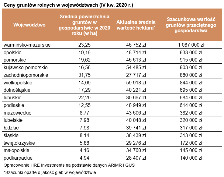 Na tym tle skromnie wygląda wartość działek składających się na przeciętne gospodarstwo w województwach: świętokrzyskim, małopolskim czy podkarpackim. Ich przeciętną wartość można szacować na od 140 do 172 tysięcy złotych – oczywiście znowu tyle sugeruje statystyka mimo, że na tym terenie znajdziemy zarówno skromne zagrody jak i potężne gospodarstwa liczące setki czy tysiące hektarów.