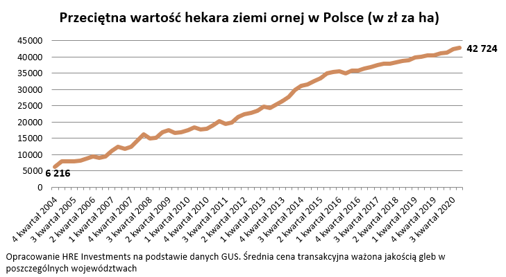 GUS podał właśnie informacje o tym ile płacono w Polsce za grunty orne w ubiegłym roku. Chyba nikogo nie powinno dziwić, że ziemia zdrożała. Zaskoczeniem może być jedynie to, że pod koniec 2020 roku za hektar trzeba było płacić o trochę ponad 5% więcej niż przed rokiem. Przecięta cena to już 42,7 tys. zł za ha – wynika z szacunków HRE Investments uwzględniających ceny transakcyjne i jakość sprzedawanych działek.