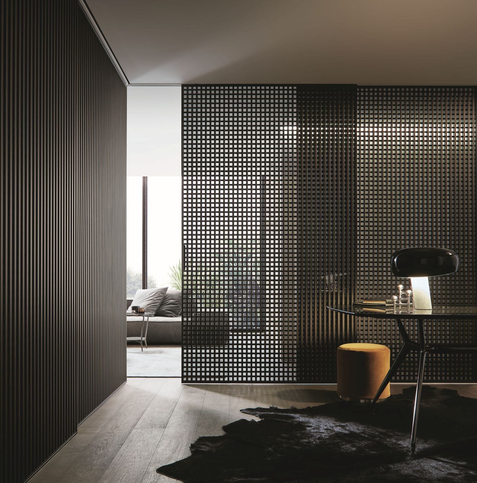 Stripe – system z poziomymi aluminiowymi listwami, nadający się do każdej części domu; od salonu, czy sypialni, do pomieszczeń biurowych. Gęsto ustawione poprzeczki nadają rytm światłu przechodzącemu przez szklany panel, subtelnie rzeźbiąc pomieszczenie.