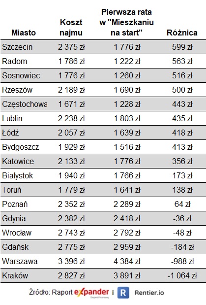 Dzięki dopłatom w większości badanych miast (w 12 z 17) rata takiego kredytu byłaby niższa niż koszt najmu. W pięciu miastach to najem byłby tańszy. Najbardziej opłacalna byłaby przeprowadzka do własnego mieszkania dla uczestników tego programu mieszkających w Szczecinie (599 zł miesięcznie), Radomiu (563 zł miesięcznie) i Sosnowcu (516 zł miesięcznie).