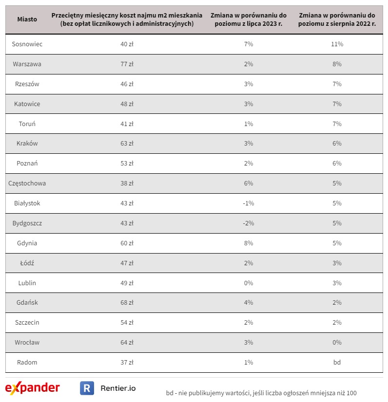 Koszty najmu za m2 w sierpniu 2023 r.