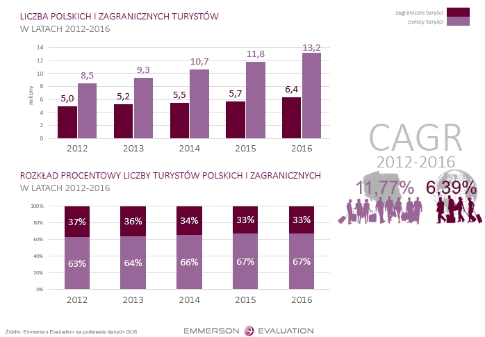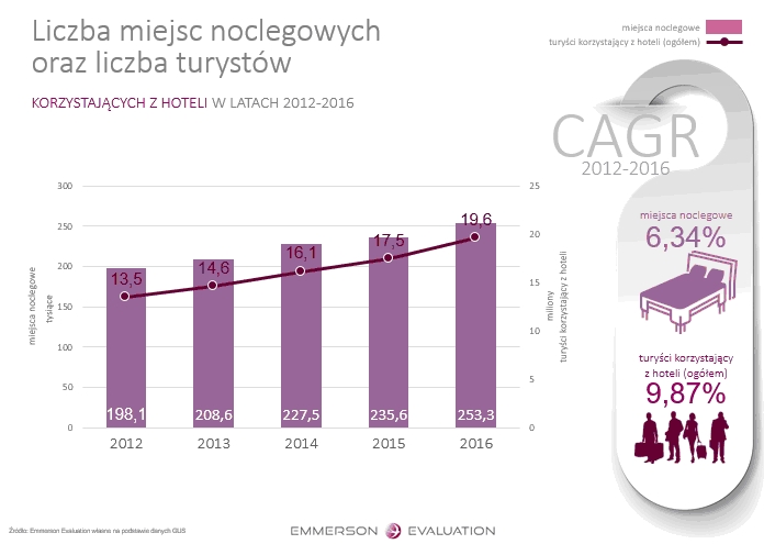 Wg danych zgromadzonych w raporcie „Rynek hotelowy w Polsce ” w 2016 r. krajowa baza obejmowała 253,3 tys. miejsc noclegowych i z roku na rok rośnie. Przybywa również turystów korzystających z polskich hoteli, ich liczba sięga już 19,6 mln. Przy czym, jak zaznaczają eksperci Emmerson Evaluation, to głównie krajowi turyści stymulują rynek. Zamożność polskich gospodarstw domowych bowiem rośnie, a wraz z nią także skłonność do ponoszenia wydatków na podróże. Współczynnik CAGR[1], tj. średni wskaźnik rocznego wzrostu, w przypadku krajowych turystów w latach 2012-2016 wyniósł 11,27%, a dla zagranicznych 6,39%. Na jednego cudzoziemca w polskich hotelach przypada więc dwóch Polaków.