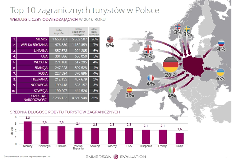 Turyści z innych państw, którzy wybierają Polskę przyjeżdżają najczęściej z: Niemiec (26%), Wielkiej Brytanii (7%), Ukrainy (6%) i Stanów Zjednoczonych (5%). – Turyści krajowi, jak i zagraniczni coraz chętniej wybierają Polskę, bo nasz kraj jawi się jako względnie bezpieczny, szczególnie w kontekście zagrożenia atakami terrorystycznymi, które miały miejsce w wielu popularnych destynacjach turystycznych. Jednocześnie obserwujemy, że jakość usług polskiego sektora turystycznego, w tym hotelarskiego, z roku na rok rośnie i jest w stanie zaspokoić oczekiwania najbardziej wymagających gości – komentuje Izabela Bednarczyk z Emmerson Evaluation.