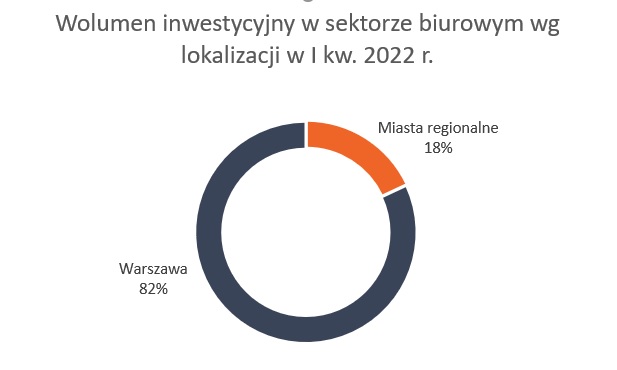 Udział sektora biurowego w całkowitym wolumenie rynku inwestycyjnego w I kwartale 2022 roku wyniósł 44%.