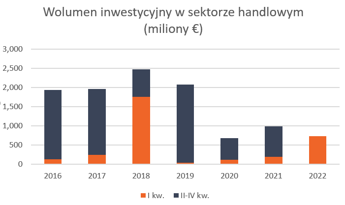 - € 728 miliony – całkowity wolumen inwestycyjny w sektorze handlowym w Q1 2022