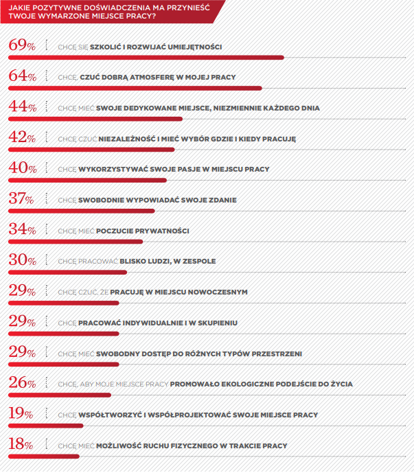 Pokolenie Z opisuje swoje wymarzone miejsce pracy jako przestrzeń wspierającą zdobywanie nowych doświadczeń i rozwijanie nowych umiejętności. Takie oczekiwania miało blisko 70% ankietowanych w badaniu przeprowadzonym na potrzeby raportu. Drugim bardzo ważnym aspektem dla generacji Z jest dobra atmosfera w pracy (64%). Przedstawiciele pokolenia Z chcą mieć również poczucie niezależności oraz możliwość elastycznego wyboru miejsca i godzin pracy.