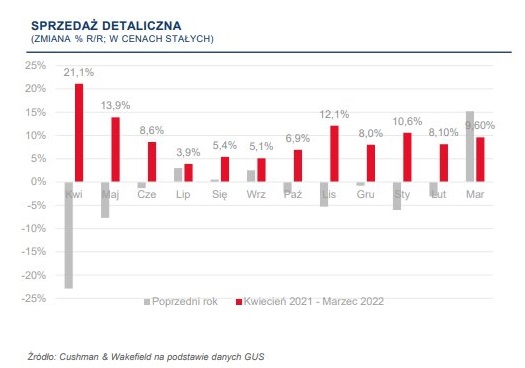 Sprzedaż detaliczna w cenach stałych w lutym i w marcu 2022 roku wzrosła odpowiednio o 8,1% i 9,6% w porównaniu do lutego i marca 2021 roku. Warty podkreślenia jest marcowy wysoki wzrost sprzedaży detalicznej ze względu na fakt, że bazą porównawczą jest wysoki – ponad 15-procentowy wzrost odnotowany w marcu 2021 roku. W tym samym miesiącu bieżącego roku największy wzrost sprzedaży detalicznej w porównaniu z marcem 2021 r. odnotowały podmioty handlujące tekstyliami, odzieżą i obuwiem (o 42%), sklepy z farmaceutykami, kosmetykami i sprzętem ortopedycznym (16%), punkty sprzedaży paliw (15,5%) oraz sklepy oferujące prasę, książki i sklepy specjalistyczne (7,3%).
