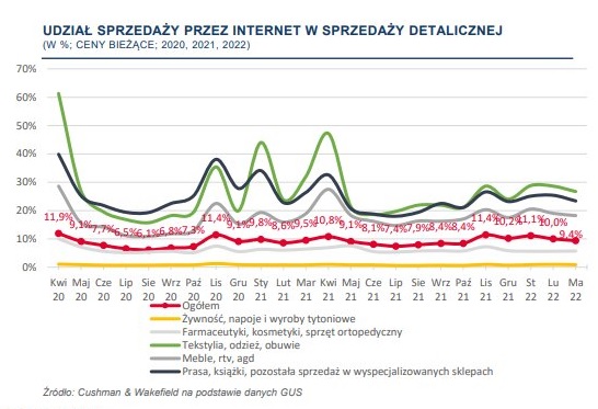 Sprzedaż internetowa osiągnęła znaczny wzrost w czasach pandemii – w okresie zakazu handlu udział tej formy sprzedaży sięgał 11%, powracając do średniego poziomu ok. 8% w trakcie znoszenia obostrzeń. Od listopada ubiegłego roku zauważalny jest wzrost sprzedaży internetowej do średniego poziomu ok. 10%, który utrzymywał się także w pierwszym kwartale 2022 roku.