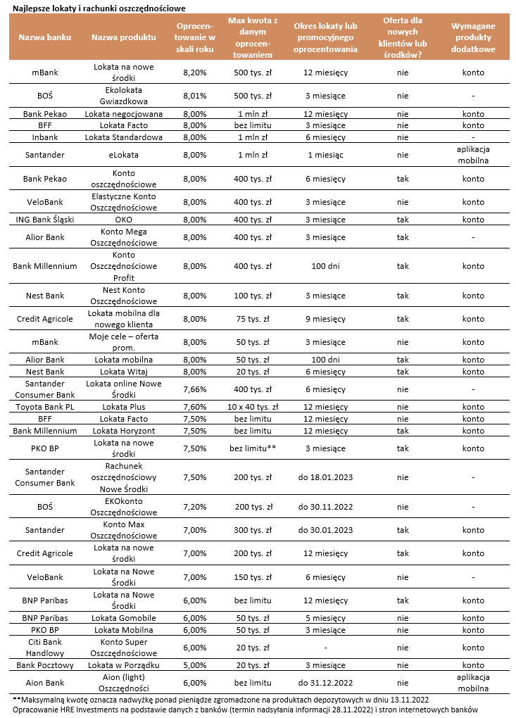 W październiku 2022 roku lokat i rachunków 8 banków kusiło nas odsetkami na poziomie co najmniej 8% w skali roku. Dziś liczba takich instytucji wzrosła do 12 (na 19 przebadanych). Posiadanie takiego produktu w ofercie staje się więc pewnego rodzaju standardem. Banki konkurując między sobą muszą dostosowywać się do panujących warunków rynkowych. Trzeba przy tym podkreślić, że często najlepiej oprocentowane oferty są obarczone dodatkowymi wymaganiami (nowy klient, nowe środki) lub produktami (konto, karta, aplikacja mobilna). Dopiero po ich spełnieniu lub kupieniu dodatkowych usług możemy liczyć na wyższe oprocentowanie.