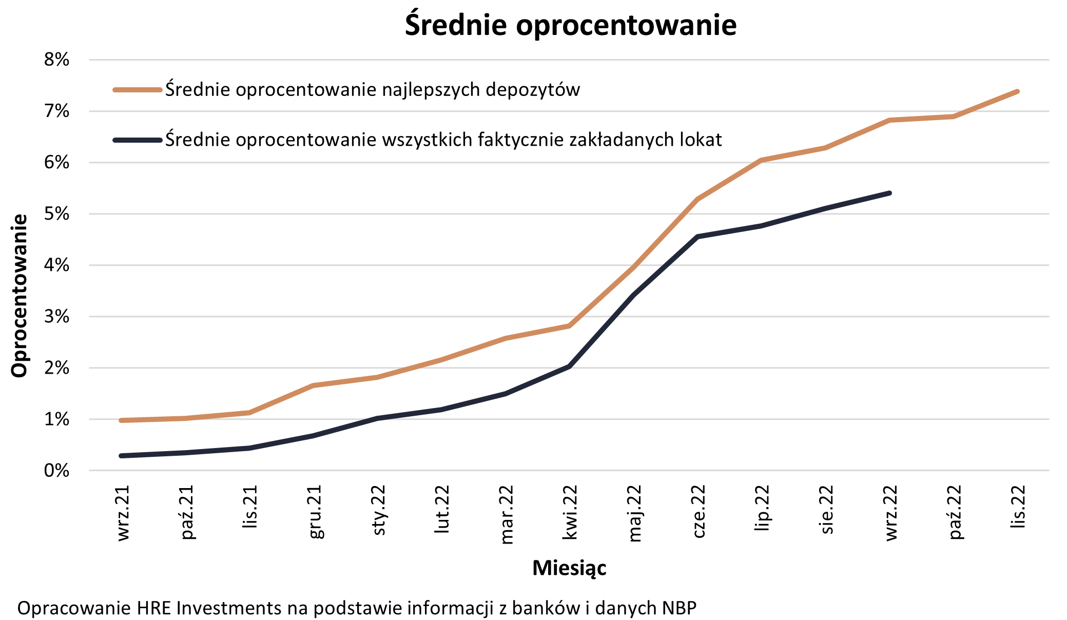 Między innymi dlatego przeciętne oprocentowanie faktycznie zakładanych przez Polaków lokat jest niższe niż wcześniej wspomniana oferta promocyjna. Niestety dane zbierane przez NBP na temat przeciętnego oprocentowania są opóźnione o ponad miesiąc. Dziś możemy przytoczyć jedynie dane za wrzesień. W dziewiątym miesiącu br. Przeciętna założona lokata oprocentowana była na 5,4%. Dziś powinno jest to pewnie już około 6% (brutto, a więc przed potrąceniem tzw. Podatku “Belki”).