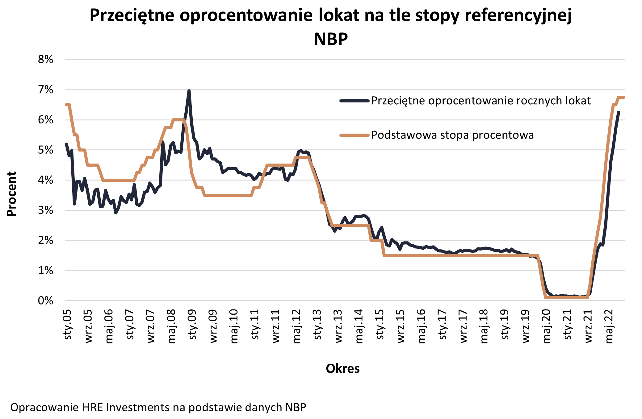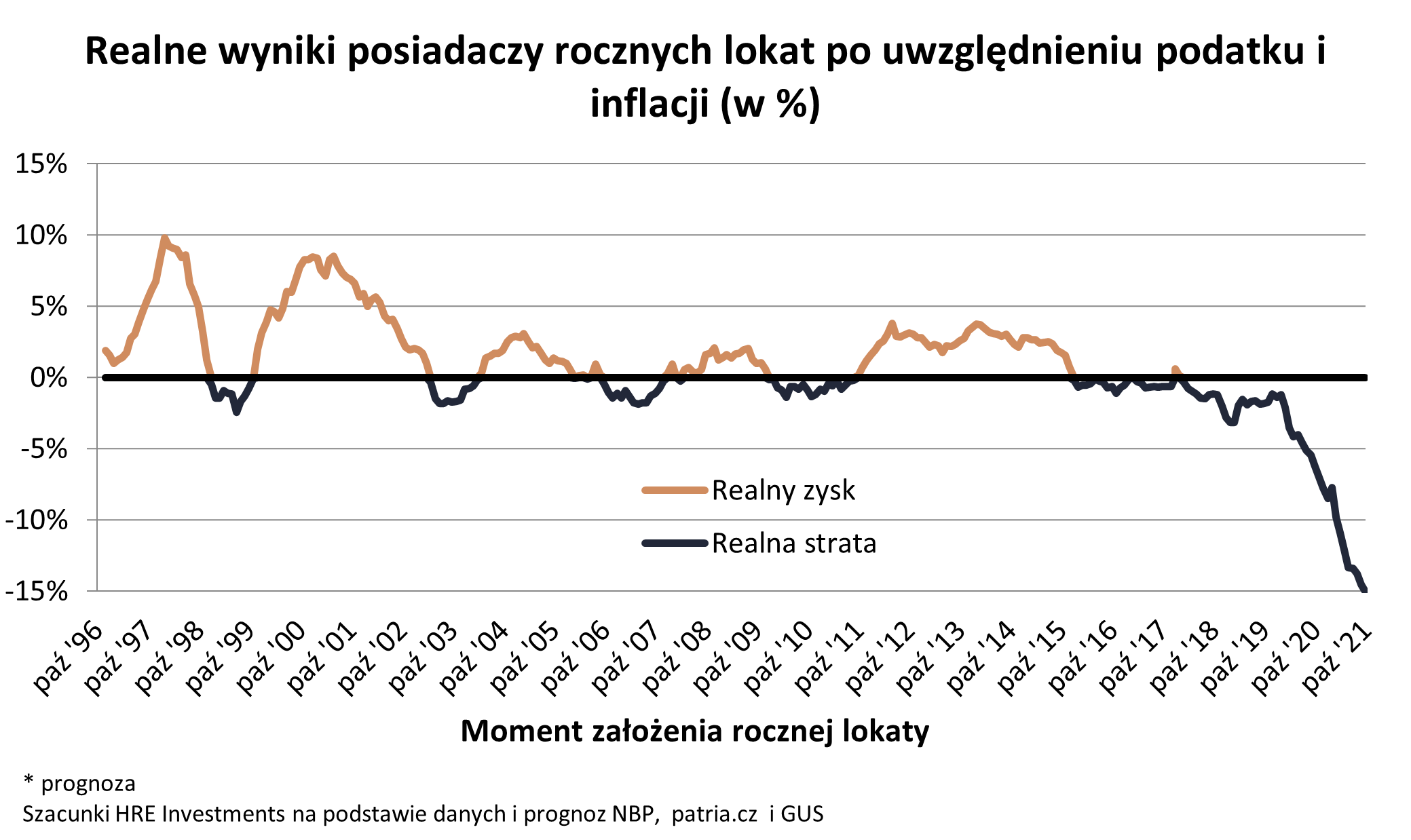 W październiku 2022 roku GUS poinformował bowiem, że ceny dóbr i usług kupowanych przez Polaków wzrosły w ciągu roku przeciętnie aż o 17,9%. To znaczy, że w okresie trwania takich depozytów ceny w sklepach rosły prawie 75 razy szybciej niż banki dopisywały odsetki do oszczędności. Efekt tego jest taki, że jeśli w październiku 2021 roku powierzyliśmy bankowi 10 tysięcy złotych na rok, to po wyjęciu tych pieniędzy z banku mogliśmy za nie kupić tylko tyle rzeczy, co za niecałe 8500 złotych w dniu zakładania depozytu. Realna strata z rocznej inwestycji wyniesie w tym wypadku trochę ponad 1500 złotych. Tak złego wyniku nie notowaliśmy od co najmniej końcówki 1996 roku, czyli od kiedy dostępne są odpowiednie dane.