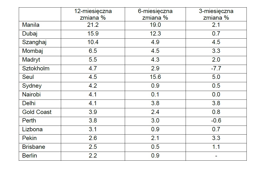 • Dubaj utrzymujący pozycję lidera 8 kwartałów z rzędu ustąpił miejsce Manili. Tam ceny w ujęciu r/r wzrosły o 21,2%.