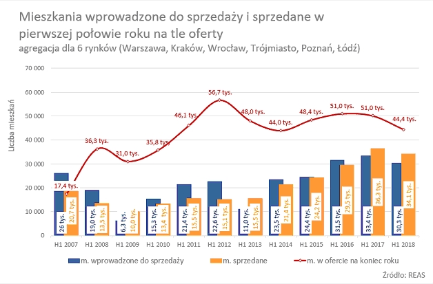Po blisko trzech latach nieprzerwanych wzrostów na pierwotnym rynku mieszkaniowym, widać wyraźne pogorszenie koniunktury. Na przełomie roku pojawiła się zadyszka po stronie deweloperów, którzy wprowadzili do oferty istotnie mniej mieszkań niż sprzedali. Zjawisko to powtórzyło się zarówno pierwszym jak drugim kwartale br. Na 6 analizowanych przez REAS rynkach (tj. Warszawie, Wrocławiu, Krakowie, Trójmieście, Poznaniu, Łodzi) pierwszym półroczu sprzedaży pojawiło się 30,3 tys. nowych mieszkań, o ponad 3 tys. mniej niż w analogicznym okresie 2017r. W tym samym czasie sprzedano 34,1 tys. mieszkań, co również było wynikiem gorszym r/r.
