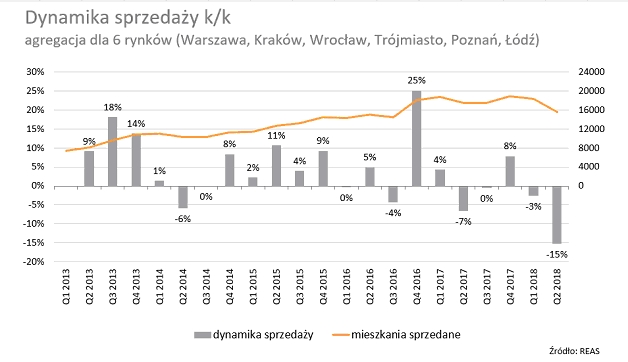 W drugim kwartale 2018 r. działający na 6 największych rynkach Polsce deweloperzy sprzedali 15,6 tys. nowych mieszkań. Był to wynik 15,2% gorszy niż przed kwartałem pierwszy tak wyraźny spadek sprzedaży od ponad 5 lat.