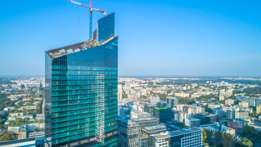 Firma Warbud aktualnie prowadzi też prace w holu głównym biurowca, gdzie układana jest posadzka, z kolei na zewnątrz wokół budynku kładziony jest kamień – już niedługo stanie się on częścią wypełnionego zielenią terenu miejskiego, dostępnego dla wszystkich mieszkańców miasta. Zwieńczeniem i perełką budynku jest zlokalizowany na dwóch kondygnacjach na wysokości 165 metrów Skybar, z którego rozpościera się niesamowity widok na panoramę Warszawy.
