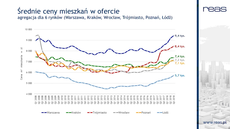 Największy, bo blisko 30% spadek odnotowano w Łodzi, gdzie liczba transakcji wyniosła „zaledwie” 0,9 tys. Dla deweloperów działających na tym rynku było to tym boleśniejsze, że Łódź, która późno zaczęła nadrabiać straty w stosunku do reszty „stawki” przez ostatnie kwartały opierała się spadkom, a II kwartał 2018 r. był najlepszym kwartałem sprzedaży w historii tego miasta. Niewiele mniejsze spadki zaliczyły Poznań (-27%) i Wrocław (-20%). Jedynym rynkiem, który poprawił wyniki sprzedaży w stosunku do rezultatu z końca czerwca było Trójmiasto (+6,4%).