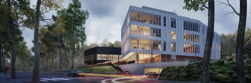 – Bryła części dydaktyczno-biurowej, która zaprojektowana została jako ogólnodostępna dla studentów pełni również rolę dominanty kompozycyjnej – wyjaśnia Zbigniew Reszka. – Usytuowana została wzdłuż osi kompozycyjnej całego założenia architektonicznego, będącej też osią historycznego Gmachu Głównego PG. Wykorzystując naturalne ukształtowanie terenu, wzdłuż osi umiejscowiliśmy trakt pieszy ze schodami, przestrzenie do odpoczynku, miejsca siedzące i elementy tarasowe dostępne z różnych poziomów budynku. Dzięki temu zabiegowi przestrzeń publiczna zaprasza użytkowników do wkroczenia między budynki, a także na szczyt wzniesienia z projektowanym założeniem parkowym, skąd otwiera się widok na Gmach Główny PG – tłumaczy.
