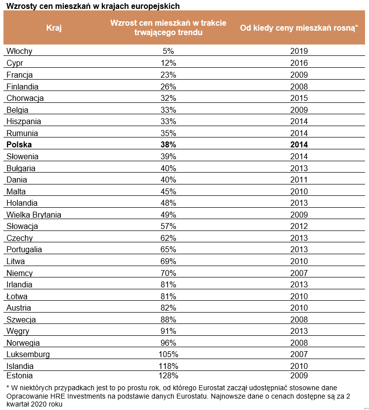Przy tym warto dodać, że dla wszystkich Państw liczymy o ile wzrosły ceny mieszkań od tzw. „dołka”. Dla każdego kraju określiliśmy więc moment, w którym rozpoczął się okres wzrostów cen trwający do dziś. W większości przypadków „bazą” były lata 2013 – 2014. Działo się tak w krajach, w których kryzys, symbolicznie rozpoczęty upadkiem banku Lehman Brothers (wrzesień 2008 r.), doprowadził do korekty cen mieszkań trwającej kilka lat. W tym gronie znajdziemy m.in. Hiszpanię, Rumunię, Polskę, Słowenię, Bułgarię czy Czechy.
