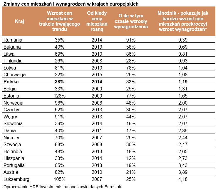 Ciekawa jest też sytuacja w Rumunii. Tam ceny mieszkań wzrosły przez około 6 lat o 35%, ale w tym samym czasie dochody Rumunów niemal się podwoiły. Miało to uzasadnienie w szybko rosnącej gospodarce. Nie bez znaczenia był też fakt dużej emigracji zarobkowej z Rumunii do bogatszych krajów unii. Wymusiło to znaczne podwyżki pensji w kraju.