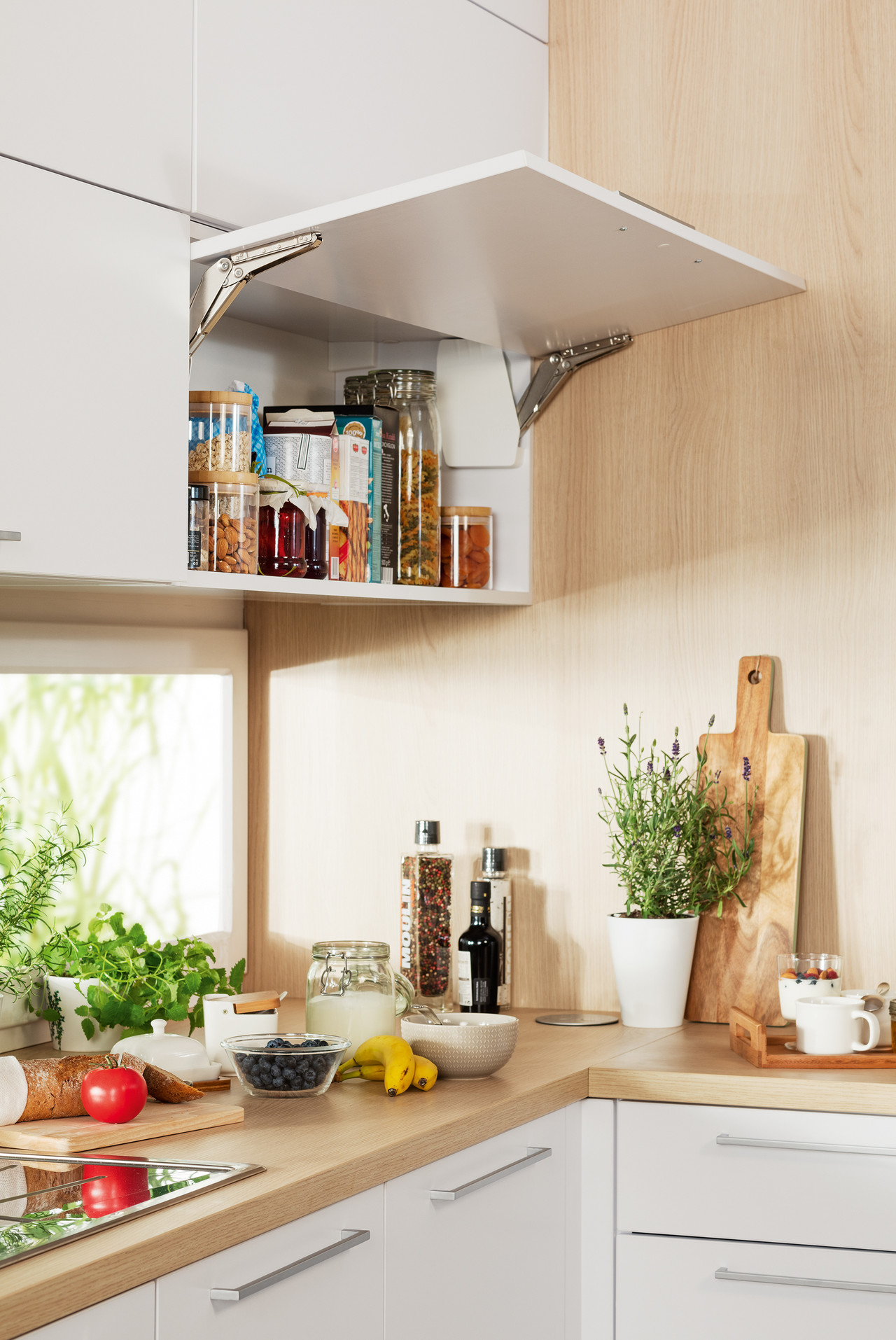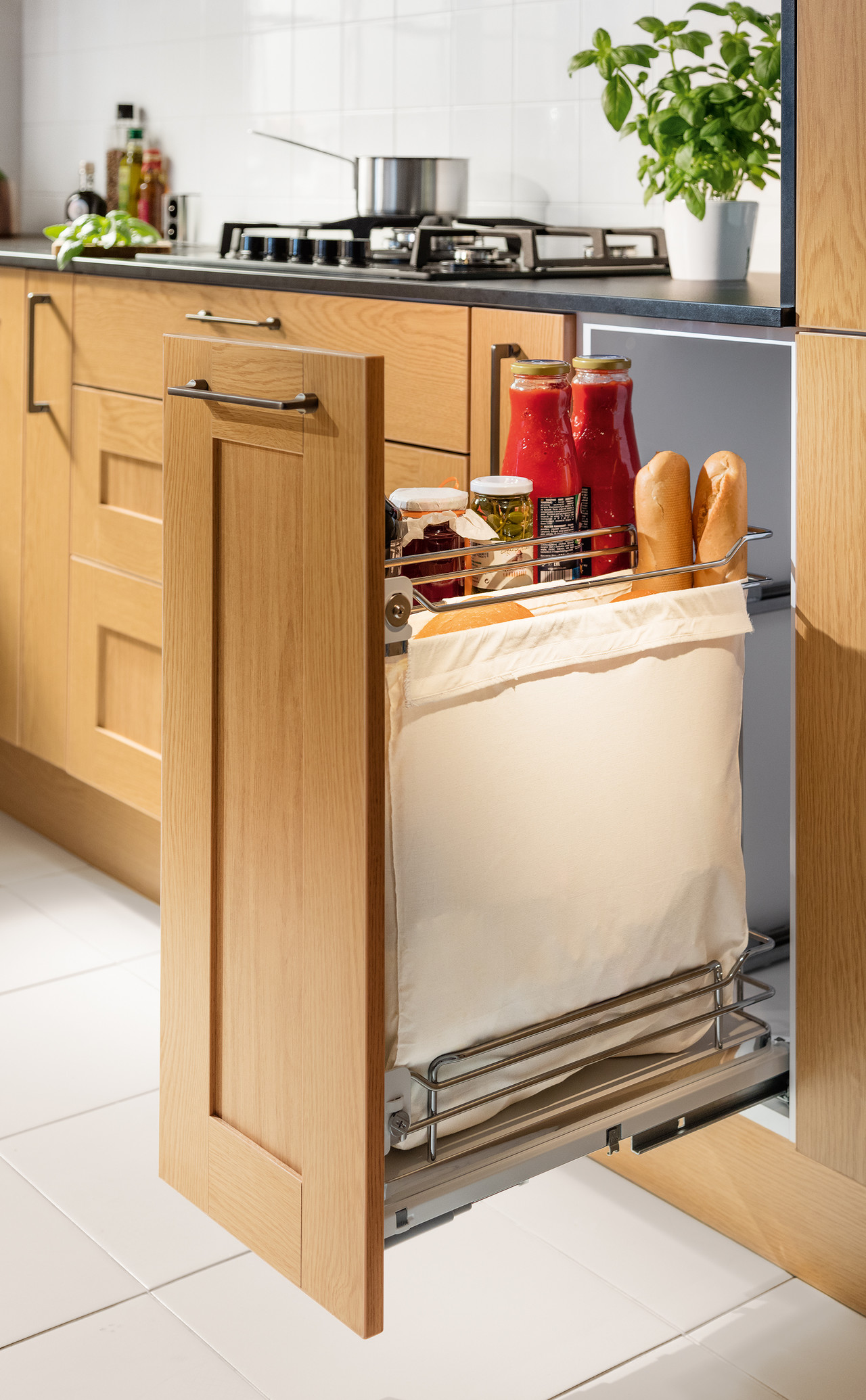 Takie rozwiązanie pozwala taż tak rozplanować układ koszy we wnętrzu, by zmieścić tam wszystko, co niezbędne i zapewnić sobie wygodny dostęp do zapasów. W starych meblach dokuczliwym problemem bywały często kłopoty z sięgnięciem po rzeczy schowane w głębi szafki. Dzisiaj można sobie z tym poradzić dzięki pomysłowym regałom z półkami, które po otwarciu wysuwają się do przodu.