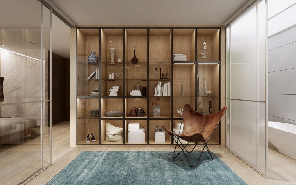 Wyspa garderobiana powinna – analogicznie do tej kuchennej – zajmować centralną część pomieszczenia, tak by umożliwiać dostęp do niej z każdej strony więcej niż jednemu domownikowi. Podstawę stanowi tu funkcjonalność tego elementu wyposażenia, dlatego zwykle zawiera on rządy szuflad i wysuwanych tac, organizery na drobne przedmioty, pojemne szafki i wnęki, a wszystko w indywidualnie wybranej kombinacji. Nie znaczy to, że aspekt wizualny schodzi tu na drugi plan, bo portfele, okulary, zegarki czy biżuteria, które najczęściej są „mieszkańcami” wysp są też perfekcyjnie i niezwykle efektownie wyeksponowane. Jest to możliwe dzięki przeszklonym elementom – blatom czy czołom szuflad – które nadają lekkości, pełniąc rolę jubilerskiej mini gabloty.