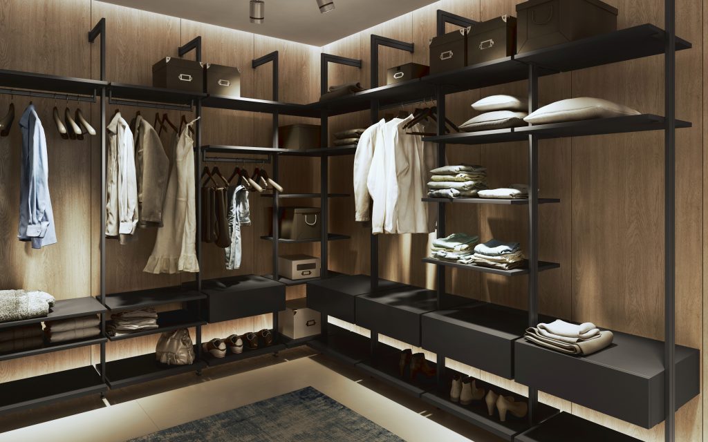 O ile wyspa nie jest obligatoryjnym elementem, o tyle bez zabudowy meblowej nie może być mowy o garderobie z prawdziwego zdarzenia. Do najbardziej tradycyjnych rozwiązań, które od lat cieszą się dużą popularnością, należą systemy półek, szafek i wnęk wykonanych z płyty meblowej. A co jest aktualnie najbardziej na topie? Odpowiedź marki Komandor na to pytanie stanowi system Orto – smukły, subtelny i lekki. Filarem i bazą takiej garderoby są aluminiowe profile nośne, pozwalające stworzyć nowoczesne ażurowe wnętrze. Pozostałe elementy – półki, szuflady, kontenery czy strefy do wieszania ubrań – można konfigurować dowolnie, aranżując garderobę na swój autorski sposób.