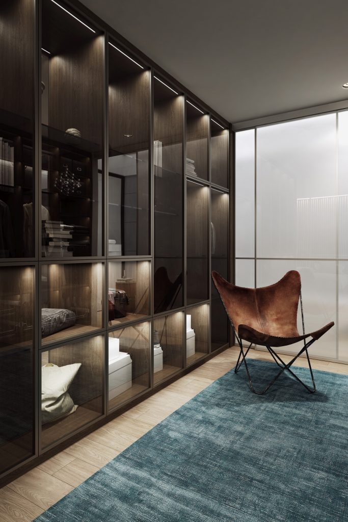Dedykowane moduły meblowe Komandora, pięknie podświetlone za zamkniętymi szklanymi drzwiami w wyraźnie odcinających się kolorystycznie ramach, urozmaicają klasyczną zabudowę. Szklane fronty służą nie tylko prezentacji odzieżowych skarbów, ale też chronią je przed osadzaniem się kurzu, a przy tym powiększają optycznie pomieszczenie. I znów strefa za szkłem okazuje się być miejscem uniwersalnym, gdzie idealnie odnajdą się również pamiątki lub eksponaty hobbistyczne, jak rzeźby przywiezione z egzotycznych podróży czy zabytkowe aparaty fotograficzne. Szklane drzwi pozwalają cieszyć się ważnymi i cennymi przedmiotami w spokoju o ich bezpieczeństwo.