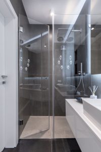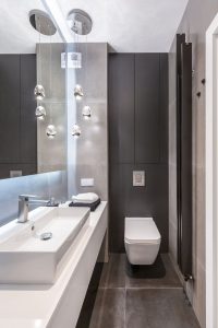 Łazienka została wykończona płytkami o delikatnej fakturze, a całość wystroju utrzymano w bieli i graficie, by nie przytłoczyć wnętrza. Kabina prysznicowa ze szklanym frontem i ciekawe, nowoczesne oświetlenie nadają pomieszczeniu interesującą surowość w świeżym wydaniu.
