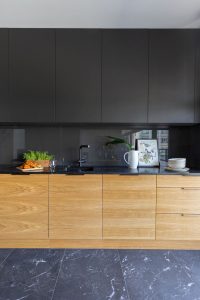 W pasie roboczym pojawia się szkło i wytworny blat z konglomeratu z delikatną złotą żyłką. Prosta, funkcjonalna i pełna celowo ukrytych udogodnień – w tej kuchni mniej znaczy więcej i z pewnością docenią to nie tylko miłośnicy minimalizmu. Wnętrze oddzielono od salonu ścianką stanowiącą umowną granicę między jasną strefą salonu, a ciemniejszą przestrzenią kuchni.