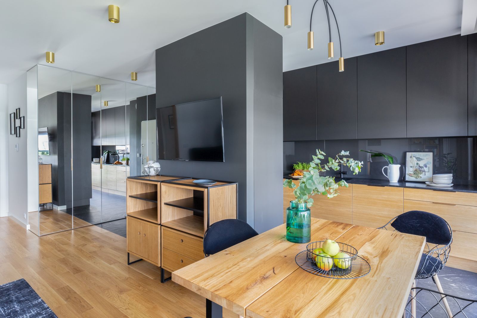 Wykończenie mieszkania wyróżniają szlachetne, głównie naturalne materiały i doskonała jakość. Na podłodze ułożono lite deski, a zastosowane płytki i gres pochodzą z Włoch. W salonie panuje bezpretensjonalna prostota o lekko surowym zacięciu soft loftu. Część wypoczynkową wydzielono za pomocą ściany pomalowanej na czarno, która posłużyła do zamontowania telewizora. Meble z litego drewna oprawiono w czarne metalowe ramy, nawiązując do industrialnych inspiracji, a szyku całości dodają nowoczesna sofa i fotel obite szmaragdowym aksamitem oraz klimatyczna lampa podłogowa. Dzięki wysokim oknom światło wpada z dwóch stron, co doświetla wnętrze i usprawiedliwia wykorzystanie ciemnych kolorów czy szlachetnych, nieco „cięższych” materiałów. Front i bok zabudowanej szafy w holu pokryto lustrami – ocierając się o neoklasykę, wyjątkowo dobrze współpracują one z loftową stylistyką.