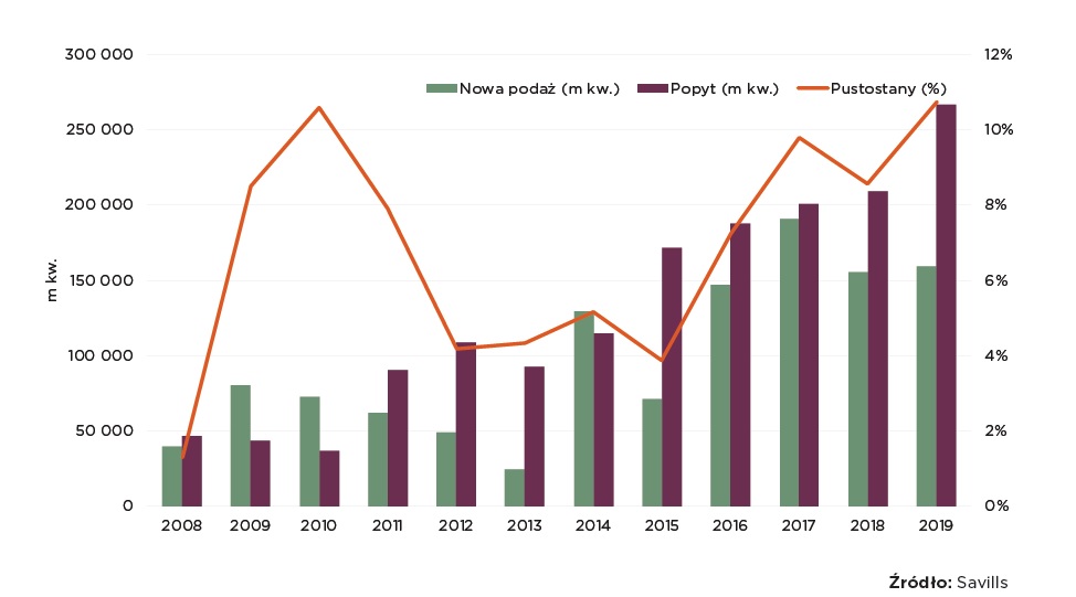 Deweloperów do inwestowania w nowe projekty zachęca wysoki popyt na powierzchnię biurową. 2019 rok był szóstym rokiem z rzędu, kiedy to każdy kolejny okazywał się lepszy od poprzedniego pod względem ilości wynajętej powierzchni. W ciągu minionych 12 miesięcy w Krakowie podpisano umowy na rekordowe 266 700 m kw. (wzrost o 28% rdr.). Za aż 38% z niej odpowiadały firmy z branży IT. Największą powierzchnię w 2019 r. wynajęła firma UBS w kompleksie Fabryczna Office Park (19 300 m kw.).