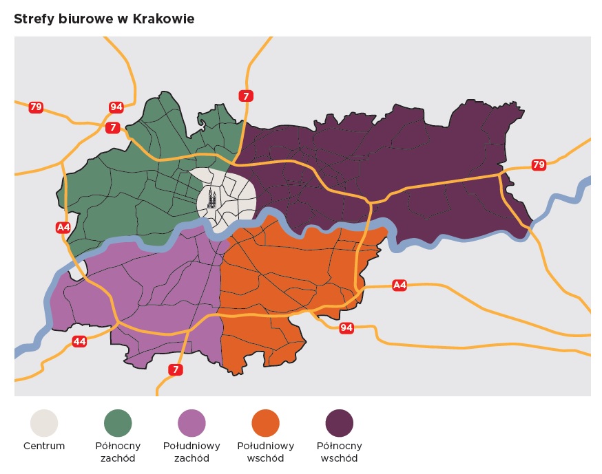 Jak wynika z najnowszego raportu firmy doradczej Savills, powierzchnia biurowa w Krakowie rozkłada się dość równomiernie na pięć głównych obszarów biznesowych. Największe skupiska biurowców znajdują się na Zabłociu i jego okolicach (159 700 m kw.) oraz przy ul. Wadowickiej (110 200 m kw.). Centrum miasta, ze względu na zabytkowy charakter, do niedawna oferowało dość ograniczoną podaż powierzchni biurowej, aczkolwiek ostatnie lata przyniosły zdecydowany wzrost nowej podaży i to również tam w najbliższych latach budować się będzie najwięcej.