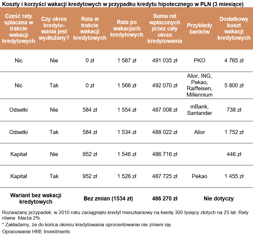 Skorzystanie z trzymiesięcznych wakacji kredytowych oznacza w tym przypadku, że przez kwartał płacimy wyraźnie niższe raty (584 złote), a potem rata rośnie do 1554 złotych. To tylko dodatkowe 20 złotych miesięcznie, a przez cały okres kredytowania dodatkowy koszt można oszacować na 738 złotych. Jeśli nasz modelowy kredytobiorca potrzebował wsparcia w formie wakacji kredytowych, to mając kredyt właśnie w tych bankach miałby powody do zadowolenia.